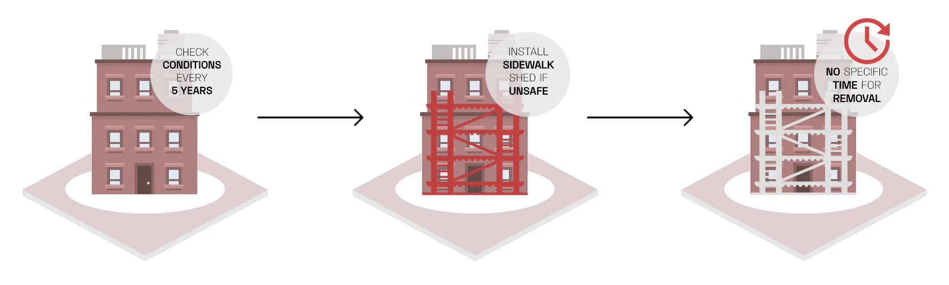 Based on Local Law 11, every five years, every building in NYC must submit a documentation regarding the conditions of its facade to the Department of Buildings. If regarded as unsafe, landlords are required to put up a sidewalk shed. This law, however, does not state when landlords are required to remove these sheds which often leads to an indefinite existence of these sheds.