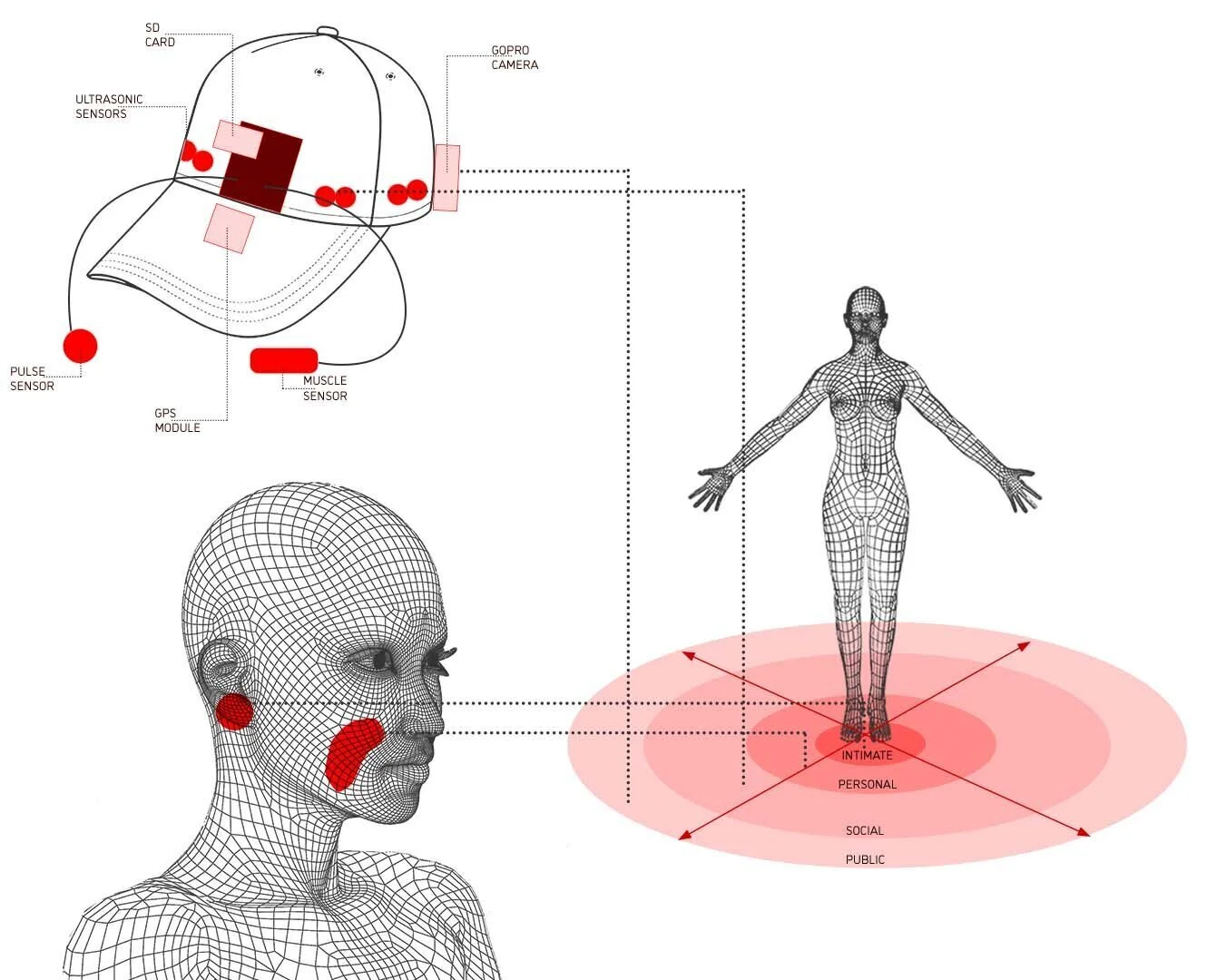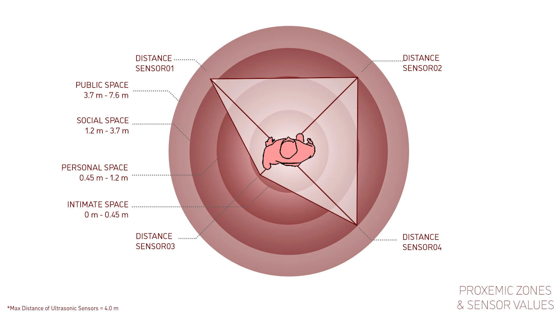 The sensors chosen are based on Edward T. Hall’s proxemics theory that identify 4 main spaces around the human body: the intimate space, the personal space, the social space and the public space. For each space, I use a sensor that can sense a characteristic of this space.