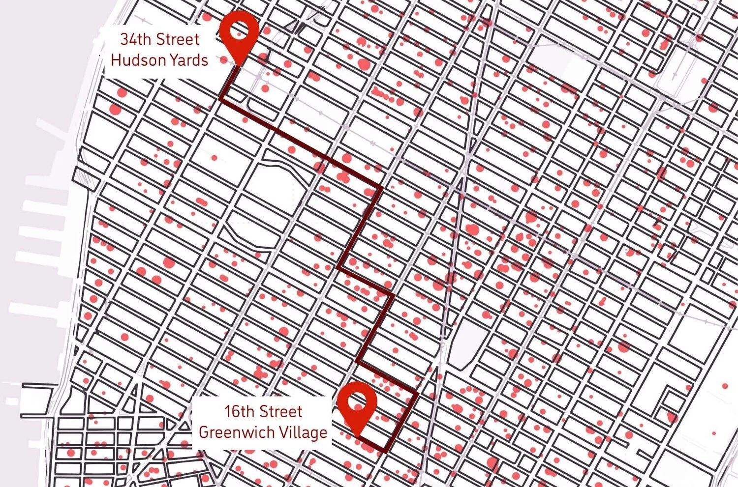 Based on data from NYC Sidewalk Sheds map, I designed a path that goes through the most amount of scaffolds while crossing through some of the city’s “multiple personalities”: